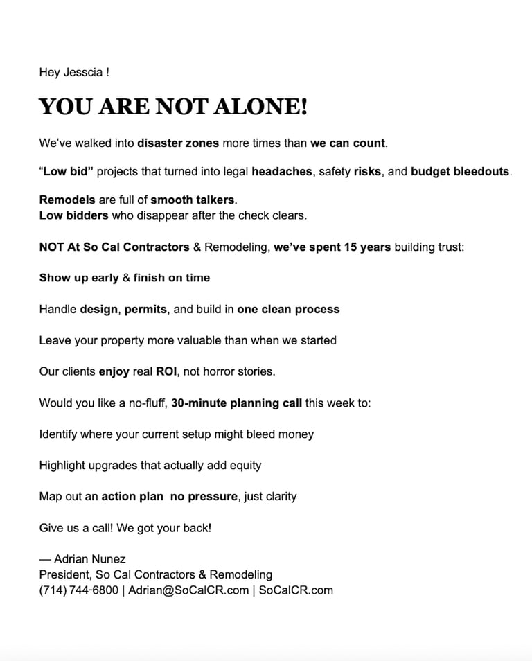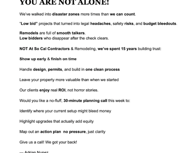 This letter does more than sell a service it reframes the contractor as a trusted advisor in a world of chaos. It cuts through the noise of cheap bids and empty promises with clarity, competence, and calm authority. By leading with empathy and ending with a clear offer of strategic support, it positions the contractor as a high-integrity operator not just a builder, but a partner in protecting wealth, peace of mind, and long-term equity. This is persuasion with purpose: clean, confident, and built to convert.