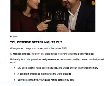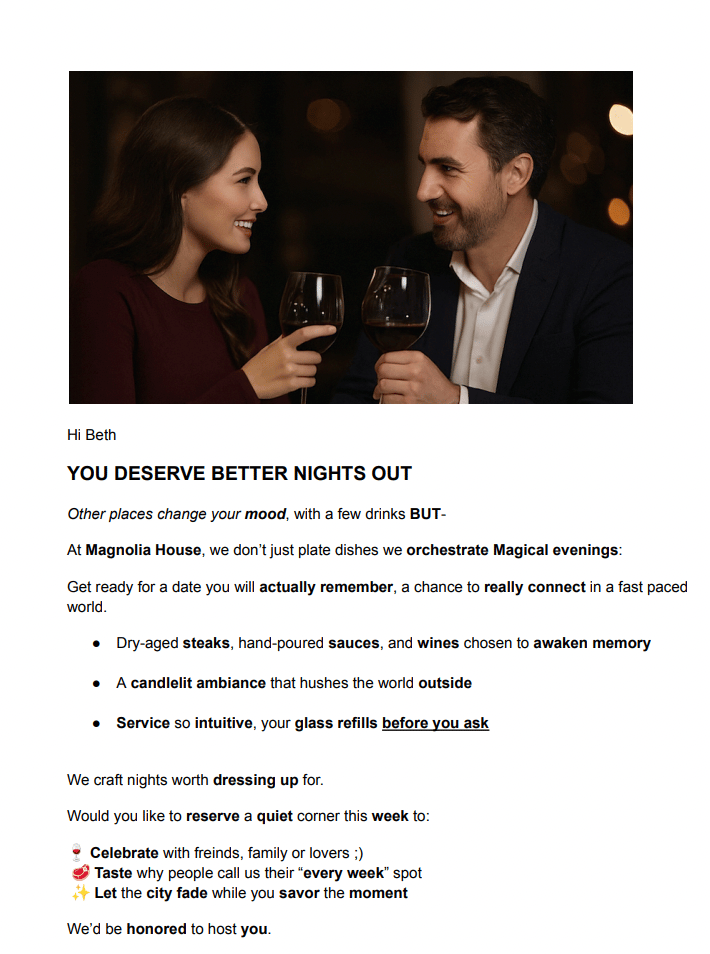 This copy letter transforms Magnolia House from just another dinner option into a destination for deep connection and timeless memory. By positioning the restaurant as an escape from the noise of modern life, it appeals to the emotional craving for presence, intimacy, and luxury. Through sensual details dry-aged steaks, hand-poured sauces, candlelight, intuitive service it seduces the reader into imagining a night they deserve, not just a meal they buy. The call to action is soft, elegant, and inclusive inviting lovers, friends, and regulars alike into something more than dinner " a moment worth remembering".