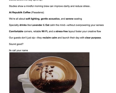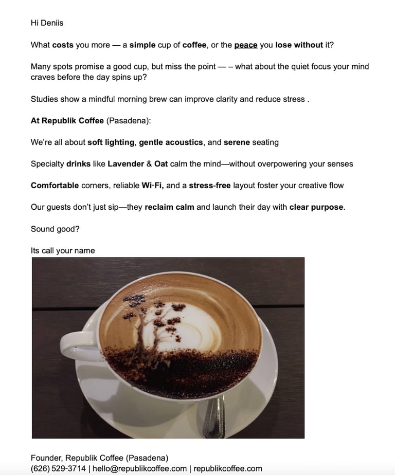 Not just an average coffee pitch it’s a calm rebellion against chaos. By framing the morning cup as a ritual of clarity rather than a commodity, the letter elevates the brand to something far greater: a sanctuary for the mind. It speaks directly to the overstimulated professional who craves focus, not just caffeine. The tone is gentle yet purposeful, drawing the reader into a space where intention meets atmosphere. This is lifestyle marketing at its most refined—emotional, strategic, and quietly irresistible.